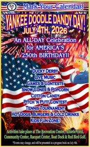 Ducky Derby, Live Music, Games & Contests, Snow Cones & Popcorn, Pitch ‘n Putt Contest, Tennis Tournament, Food & Cold Drinks, Kids Fun Zone! NO entry fee!!