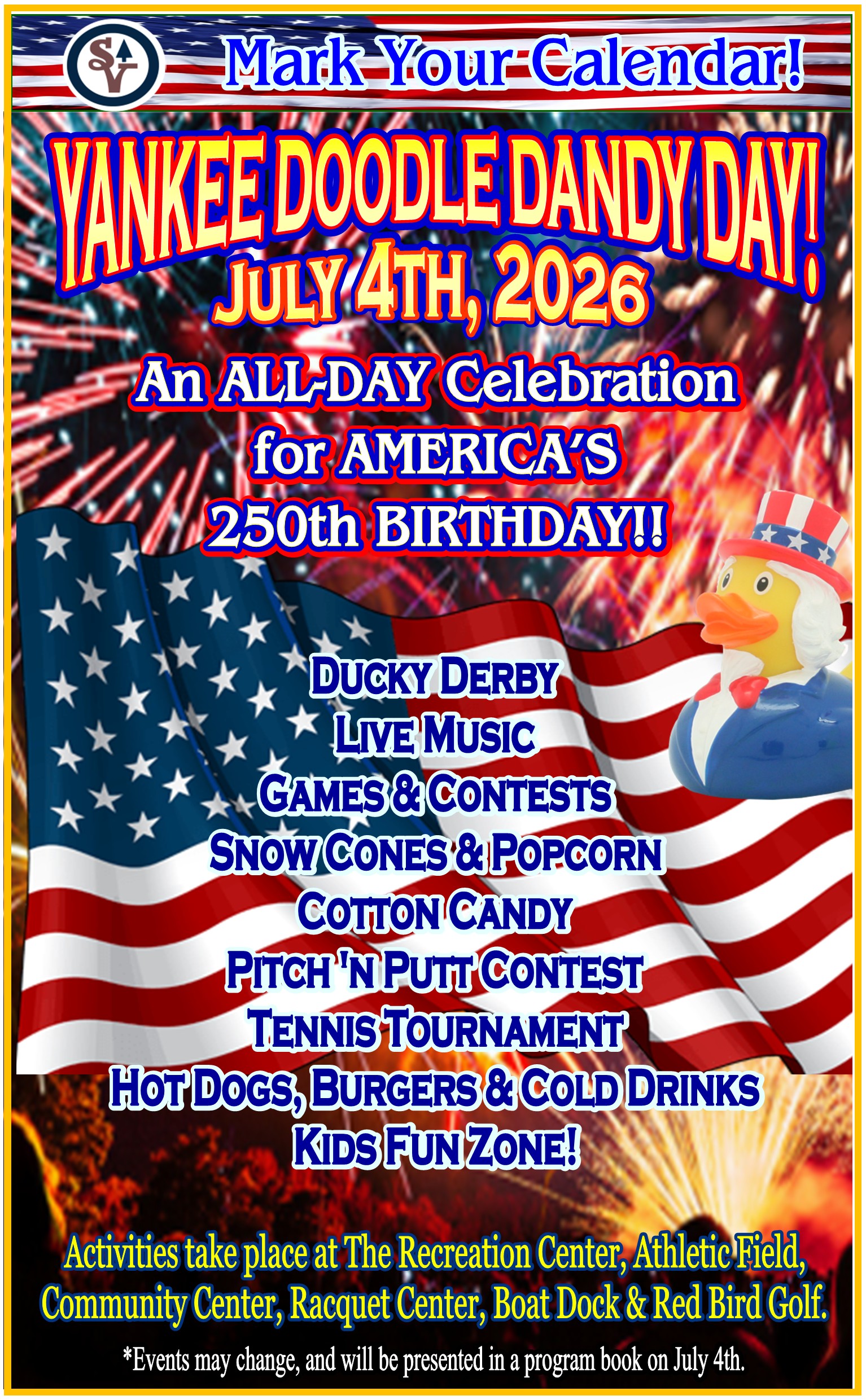 Activities take place at The Recreation Center, Athletic Field, Community Center, Racquet Club, Boat Dock & Red Bird Golf.